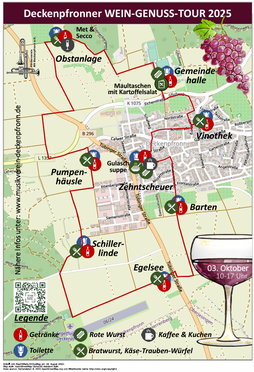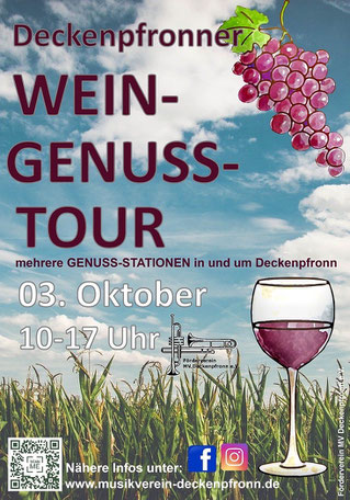 Am Freitag, den 3. Oktober 2025 veranstaltet der Förderverein Musikverein Deckenpfronn e.V. wieder seine WEIN-GENUSS-Tour. Wir freuen uns sehr, wieder mit dabei zu sein. Wie auch schon in den vergangenen Jahren, werden auf einem attraktiven Rundweg um und durch Deckenpfronn an verschiedenen Stationen ausgewählte Weine und Schnapserzeugnisse angeboten.